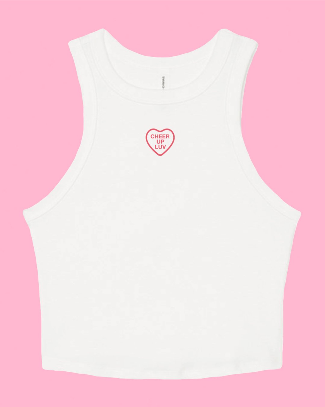 Unisex micro rib racer tank in white with embroidered Cheer Up Luv logo
